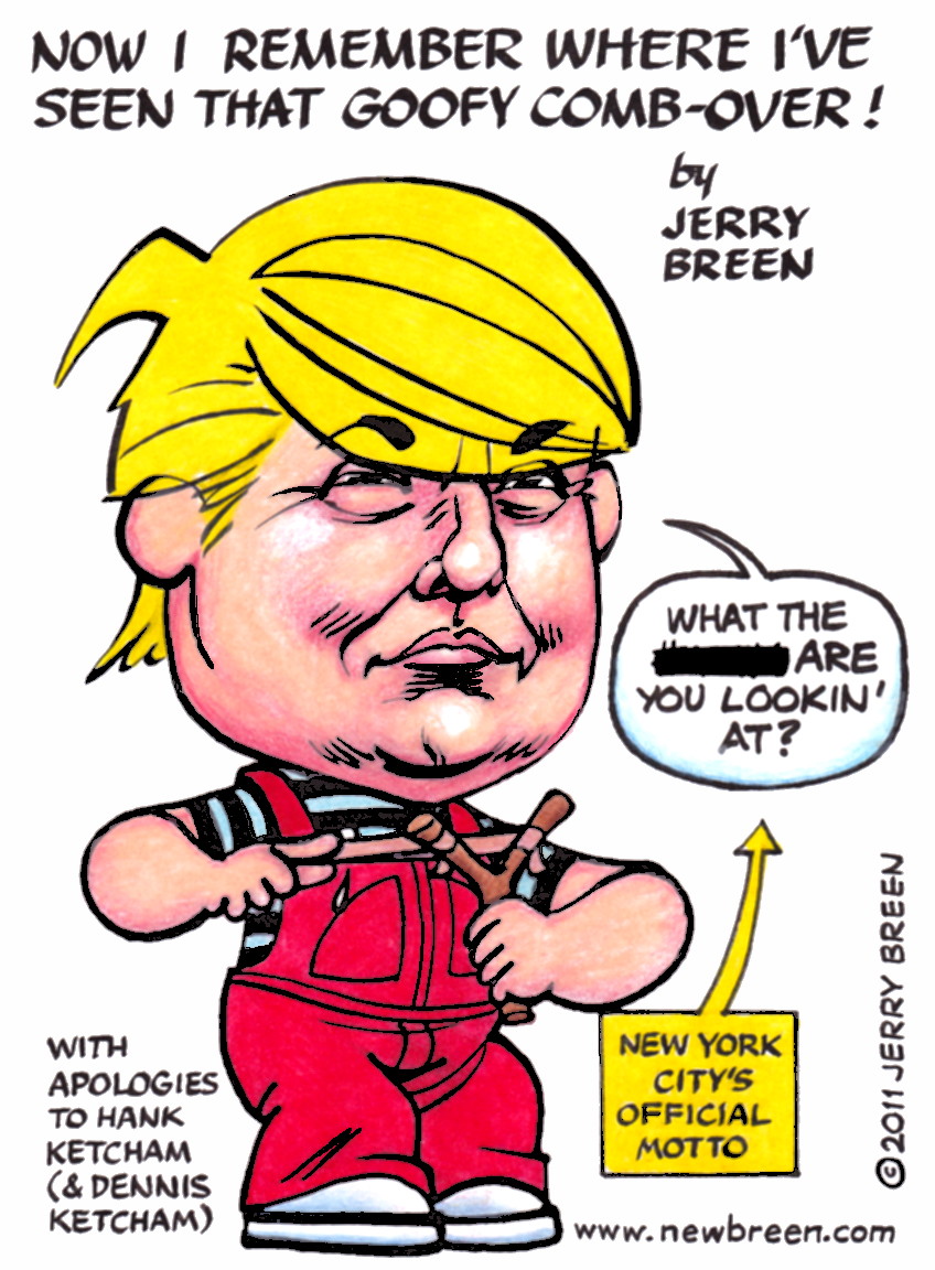 Apr 21, 2011 CARTOON: Breen, Jerry (MC1971) Trump’s weird comb-overJohn: I just noticed that Donald Trump’s weird comb-over bears a remarkable resemblance to a certain cartoon character’s hair. I don’t know why I never noticed it before. – Jerry Breen![]() # – # – # Breen, Jerry (MC1971) # – # – # – # – # 2011-Apr-21 @ 21:53 |