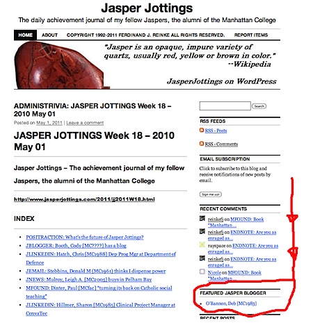 May 1, 2011 ADMINISTRIVIA: Adding a “FEATURED JASPER BLOGGER”http://goo.gl/53OBHIn order to spread the “link love” around, … <”link love” is when a site links to another site, google MAY raise both sites in the search results since it is an indication that both sites are worthy. That is not a spamer, “trasher”, or content farm. Or a plagiarizer. Or, some other type of “bad guy”. With a PR of 3, Jasper Jottings has some measure of Google “clout”, often called “juice”, when Google does it’s mystical calculation for search results. Frequently, I see Jasper Jottings on page 1 of searches that I do relative to “manhattan college”, so it has some “juice” with Google. By linking to the blogs of our fellow alums, I’m trying to share the “juice”.> … I’ve created a page to itemize them, and give them some “link love”. Hopefully, it helps. If you’re a Jasper and you blog and you’re not on my list, please send me an email and I’ll add you. WORDPRESS, the software that “publishes” the Jasper Jottings Daily Blog http://jasperjottings-daily.com/, allows me to “feature” these blogs. So every day, some one gets a link on the front page. FWIW. ![]() Send me an email if you want the “link love”. :-) # # # # # |