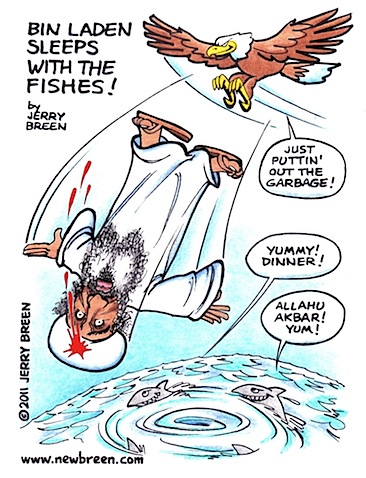 May 3, 2011 CARTOON: Breen, Jerry (MC1971) reacts to OBLJohn: Here’s a new Bin Laden cartoon. Good riddance to bad garbage! Thanks, Jerry Breen![]() # # # # # [JR: Sigh. I'm a mixed emotions on this one. Killing is always ... wrong. As a little L libertarian, there are few cases where it is "justified". Pro-life pro-choice, you know. In this case, maybe it was justified. But "eye for an eye" ... ... You may have to put a "mad dog", but there's some steps that need to be observed along the way. I'm not sure that all those were done. Otherwise, what happens if the Gooferment, politicians, or bureaucrats decide that they don't like cartoonists or fat old white guy injineers?] # – # – # – # – # 2011-May-03 @ 22:31 |