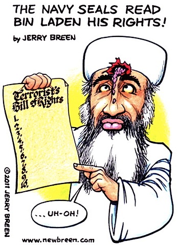 May 5, 2011 CARTOON: Breen, Jerry (MC1971) the Navy Seals and OBL’s “rights”John: Here’s a cartoon on the issue of whether the Navy Deals violated UBL’s “rights” by executing him on the spot. The fact is that spies, saboteurs and terrorists have no rights. Period. It’s a myth that people believe, like that ship captains can marry couples. It’s simply untrue. – Jerry Breen![]() # – # – # – # – # 2011-May-05 @ 08:24 |