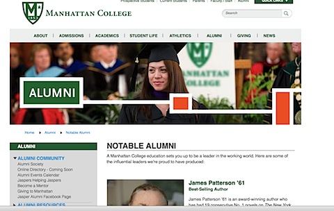 2011-12-05JEMAIL: McGoey Tom (MC1969) touts Patterson, James [MC1969]From: McGoey Tom (MC1969)Date: Sun, Dec 4, 2011 at 2:01 PM Subject: NYTimes.com: Inside the List The New York Times E-mail Message from sender: "Jim Patterson '69 noted by NYT." BOOKS | December 04, 2011 TBR: Inside the List By GREGORY COWLES "Kill Alex Cross," the latest entry in James Patterson's signature detective series, storms the hardcover fiction list at No. 1. # - # - # [JR: Thanks, Tom. I don't report on Patterson, unless it's something "newsworthy". You have to admire the guy as a prolific writer. He should be the "face" of Manhattan College alumni; not as Rudy was before his divorce.] # - # - # - # - # 2011-Dec-05 @ 08:52 originally at: http://goo.gl/6LYKM |