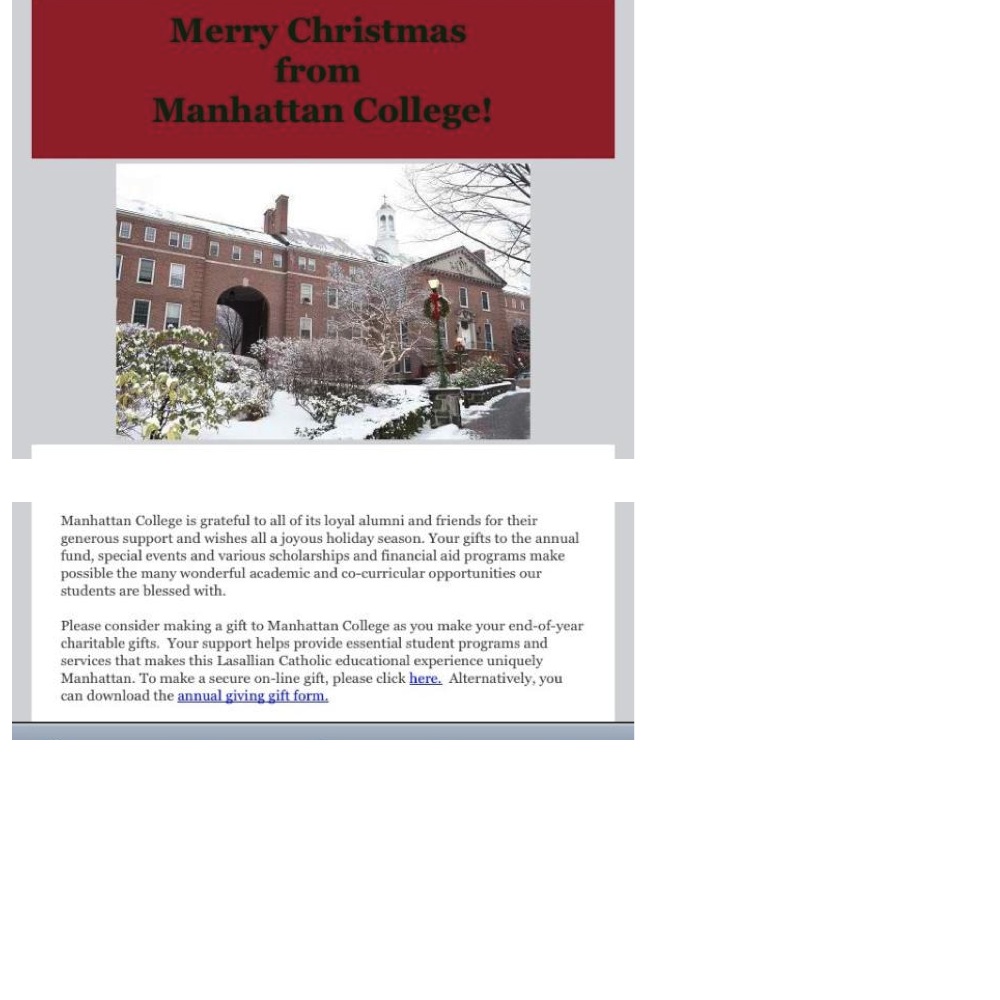 2011-Dec-21MFOUND: MC's Christmas greeting reactionREPORTING LIVE FROM THE TWITTER NEWS DESK IN THE VIRTUAL JASPER JOTTINGS NEWSROOM …Are you for real manhattan college? http://pic.twitter.com/6Tj6K43a [JR: Name deleted. Not fair to whay I think is a common reaction, I know I had it. "A Christmas is not the time to 'panhandle'. And, has ANYONE learned the first rule of 'networking'? First ] ![]() [JR: And, as a techie nit picker, who leaves a space between the "dear so and so" and the comma that follows? Answer: Some one who's not very precise at their task. I know what Doctor Zia would say: "You English Major. No extra space. Receiver insulted. Bridge ... err, request fall down. No credit". And to "Hey, we tried." "Bridge fell down; noooooo partial credit." ROFL! I guess they meant well. Never assume malice, when ... ] # - # - # - # - # 2011-Dec-21 @ 08:11 |